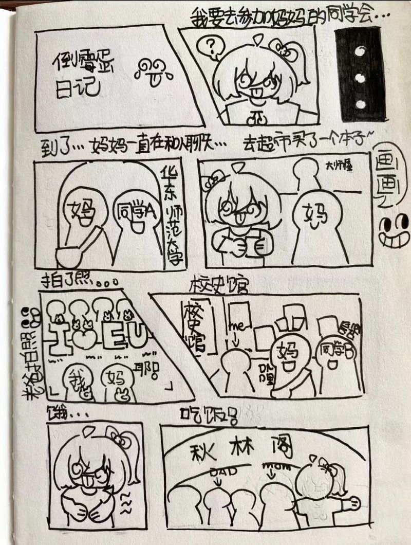 7月22日,1999级(2003届)生物技术专业的20余位校友在普陀校区聚会。校史馆、生物馆、理科大楼、秋林阁……在一个个熟悉又陌生的校园场所,校友们找寻着青春足迹,邂逅转瞬年华。随父母一同前来校园参观的“华二代”不仅被校园的优美风景所吸引,还手绘漫画日记,为大家记录下了难忘的行程。
